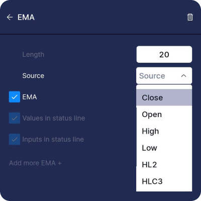 For example, you can change EMA source to OHLC, HL2 or HLC3. For Bollinger Bands, you can change the MA type to EMA, SMA, WMA, DEMA, or TEMA.