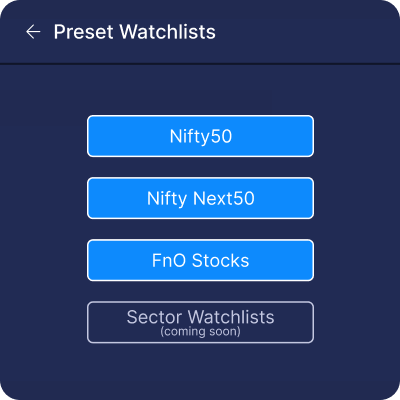 You'll continue to have access to your beloved preset watchlists – NIFTY 50, NIFTY NEXT 50, and FnO watchlists.